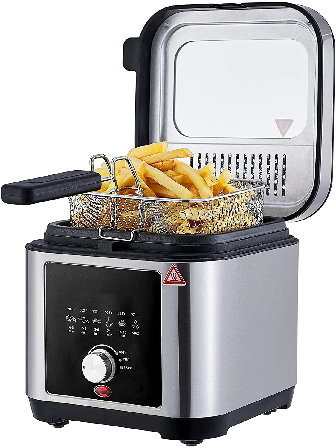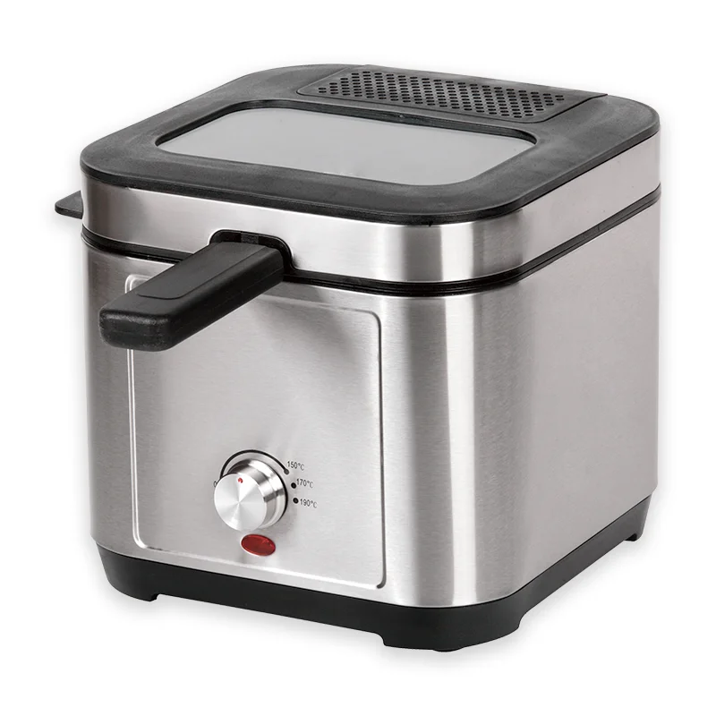 220-240V, 50/60Hz, 1200W Capacity: 2.5L Brushed S/S housing Variable temperature: 150-190?? Temperature control by thermostatRemovable lid with large window and filter Non stick coated, fixed oil tank with non sitck coating Cool-touch handle Indicatorlight Overheat protection