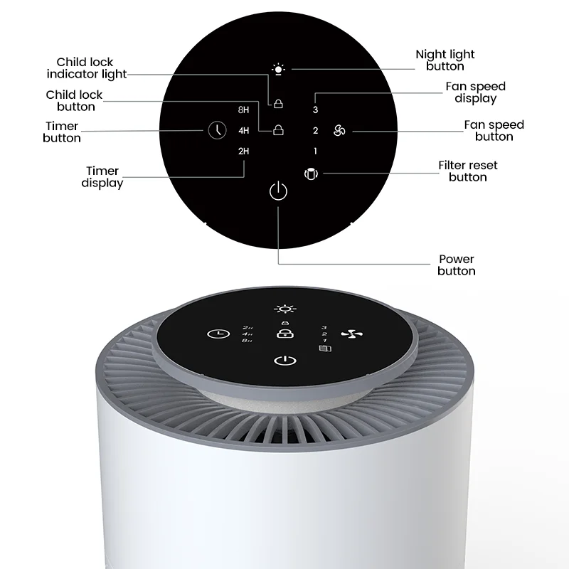 Model NumberLY-PD1Voltage100-240V adapterPower5WCADR60 m3/hUsable Area10-15?OSize(mm)160x160x246Function1. 3 gear speed 2. Night light 3. Touch for esay operate 4.Timer control(2-4-8H) 5. Formaldehyde removal, hepa 13 filter6.children lock 7.Filter replacement reminding